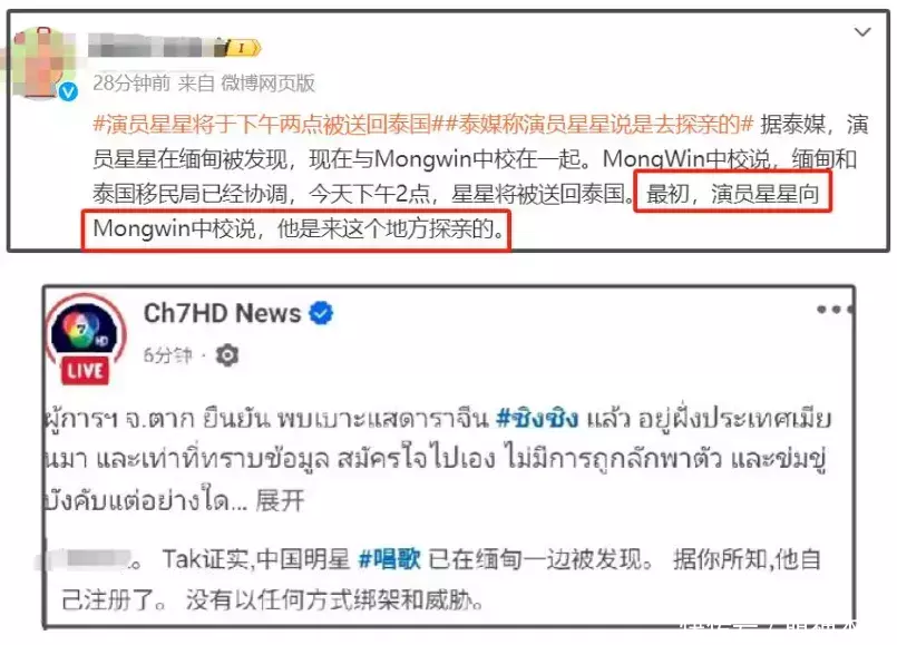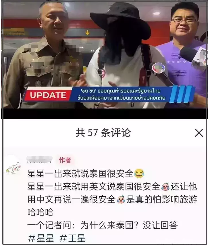 还有网友跟踪了泰国电视台的直播,看到了王星罗致采访,一出来就说泰国很安全,还是双语回话,说了一遍英文之后,又讲了一遍中语——奥秘的是,他莫得回答记者为何去泰国的发问。