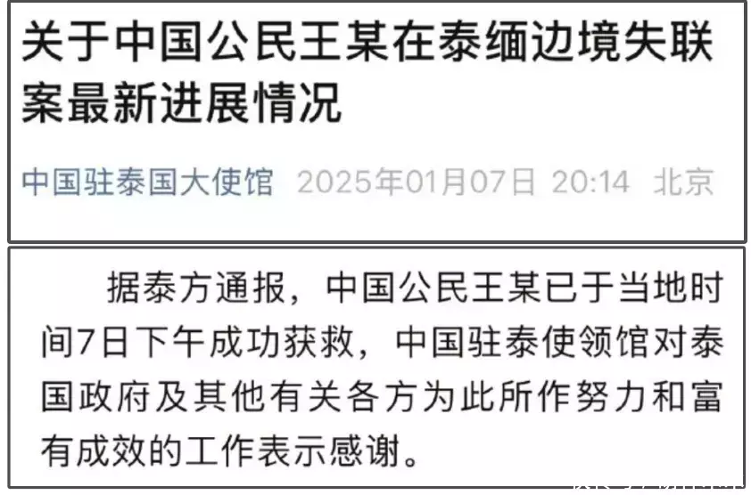 随后,中国驻泰国大使馆通报,中国公民王某已于当地期间7日下昼收效获救,中国驻泰使领馆对泰国辩论各方为此所作纳闷暗意感谢。